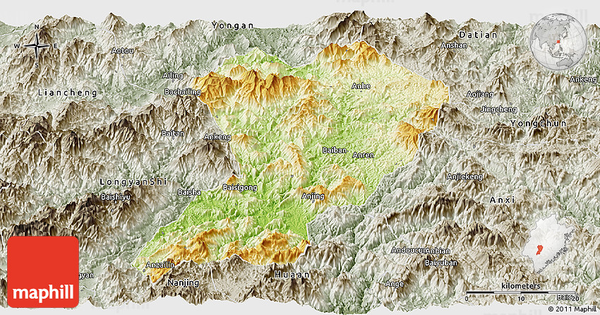 The panoramic physical map represents one of several map types and styles available. Look at Zhangping, Fujian, China from different perspectives.