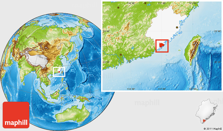Maphill is a collection of map images. This image combines a physical map with the globe centered on Zhangpu. Use the buttons under the image to switch to different map types.