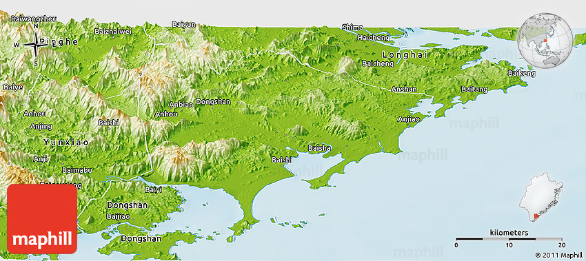 Physical map illustrates the mountains, lowlands, oceans, lakes and rivers and other physical landscape features of Zhangpu. Differences in land elevations relative to the sea level are represented by color.