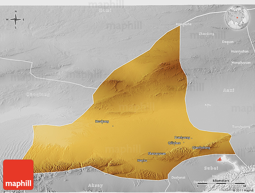 Physical map illustrates the mountains, lowlands, oceans, lakes and rivers and other physical landscape features of Dunhuang. Differences in land elevations relative to the sea level are represented by color.