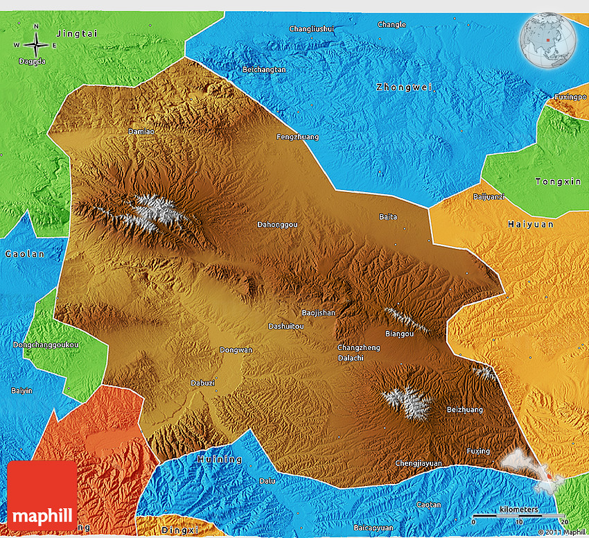 Physical map illustrates the mountains, lowlands, oceans, lakes and rivers and other physical landscape features of Jingyuan. Differences in land elevations relative to the sea level are represented by color.