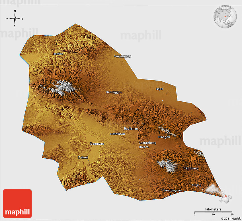 Each map type offers different information and each map style is designed for a different purpose. Read about the styles and map projection used in the above map (Physical 3D Map of Jingyuan, single color outside).