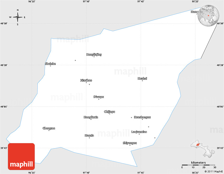 The simple silver style outline map represents one of several map types and styles available. Look at Yumen Shi, Gansu, China from different perspectives.