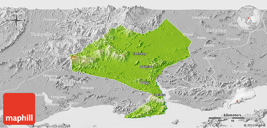 Physical map illustrates the mountains, lowlands, oceans, lakes and rivers and other physical landscape features of Enping. Differences in land elevations relative to the sea level are represented by color.