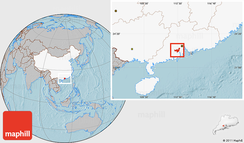 Maphill is a collection of map images. This image combines a gray map with the globe centered on Heshan. Use the buttons under the image to switch to different map types.