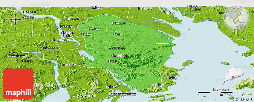 Physical map illustrates the mountains, lowlands, oceans, lakes and rivers and other physical landscape features of Zhongshan. Differences in land elevations relative to the sea level are represented by color.