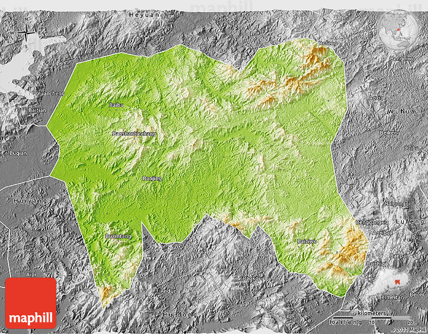 Physical map illustrates the mountains, lowlands, oceans, lakes and rivers and other physical landscape features of Zijin. Differences in land elevations relative to the sea level are represented by color.