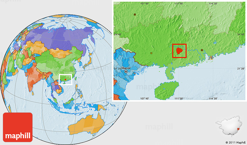 Maphill is a collection of map images. This image combines a political map with the globe centered on Cenxi. Use the buttons under the image to switch to different map types.