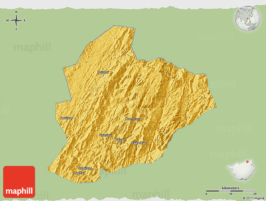 Each map type offers different information and each map style is designed for a different purpose. Read about the styles and map projection used in the above map (Savanna Style 3D Map of Longsheng, single color outside).