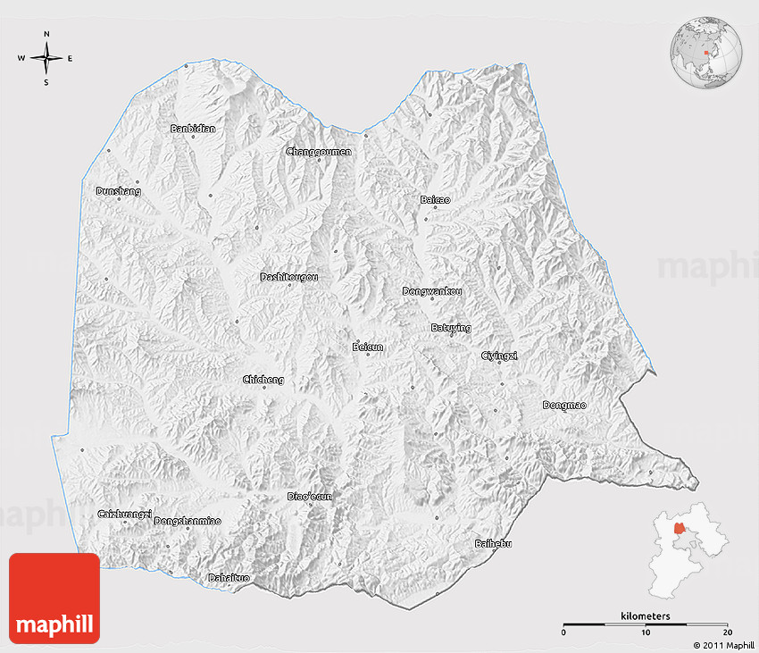 Each map type offers different information and each map style is designed for a different purpose. Read about the styles and map projection used in the above map (Silver Style 3D Map of Chicheng, single color outside).