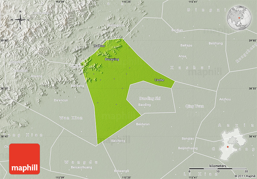Physical map illustrates the mountains, lowlands, oceans, lakes and rivers and other physical landscape features of Mancheng. Differences in land elevations relative to the sea level are represented by color.