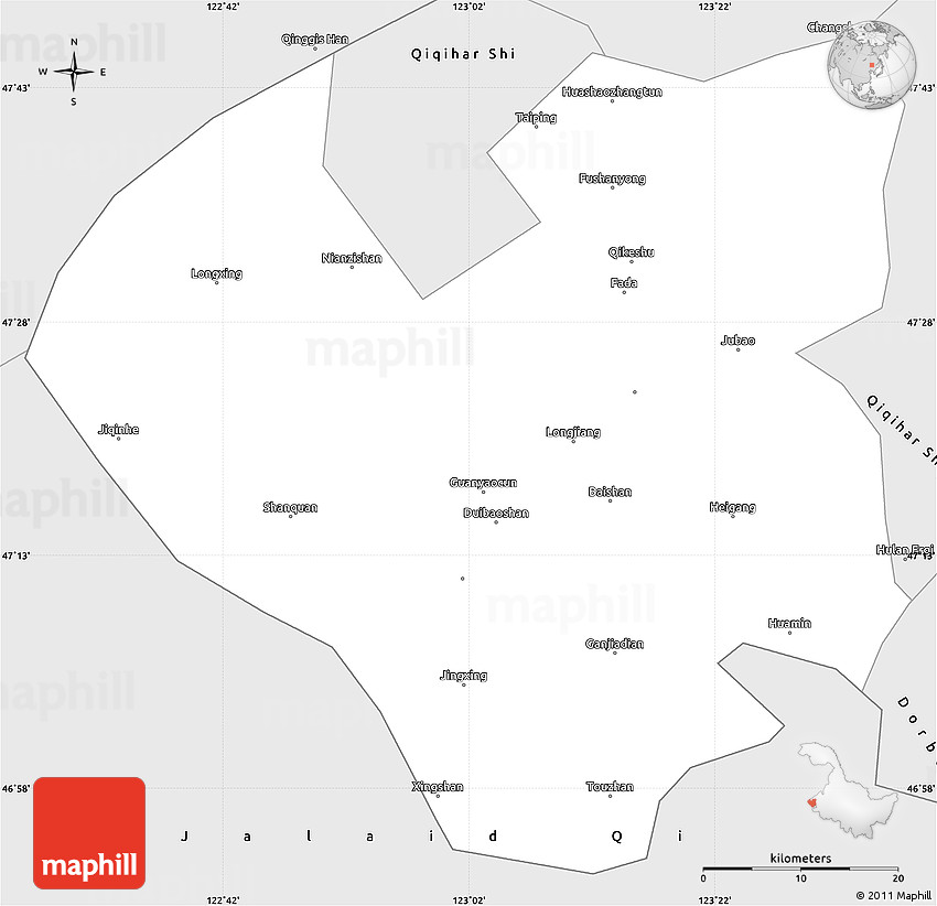 The simple silver style outline map represents one of several map types and styles available. Look at Longjiang, Heilongjiang, China from different perspectives.