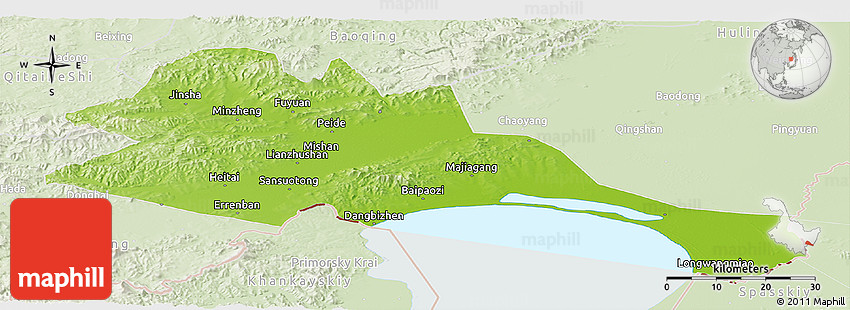 Physical map illustrates the mountains, lowlands, oceans, lakes and rivers and other physical landscape features of Mishan. Differences in land elevations relative to the sea level are represented by color.