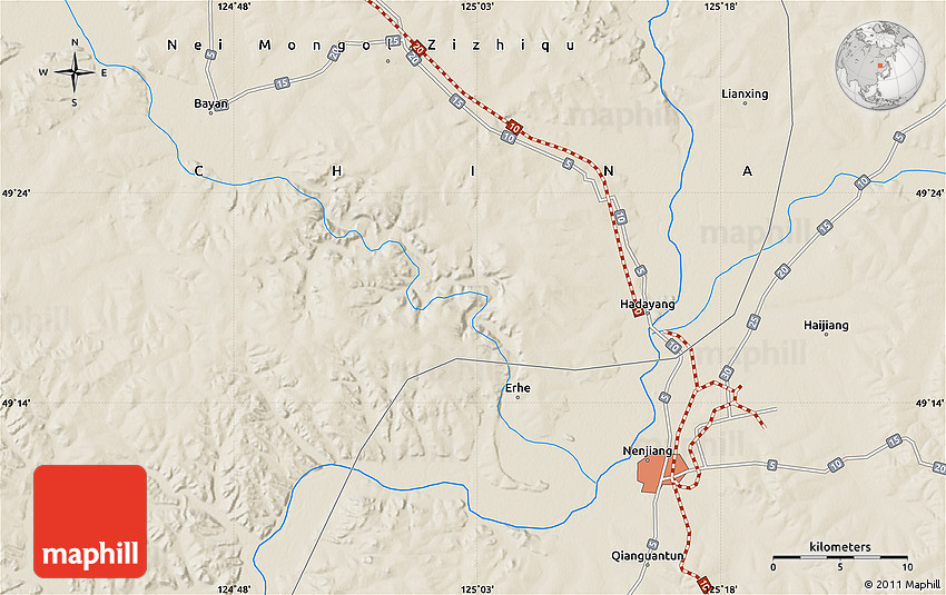 The flat shaded relief map represents one of many map types available. Look at Haijiang, Nenjiang, Heilongjiang, China from different perspectives.
