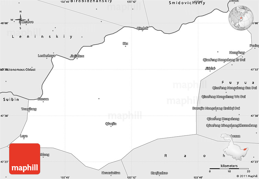 The simple silver style outline map represents one of several map types and styles available. Look at Tongjiang, Heilongjiang, China from different perspectives.