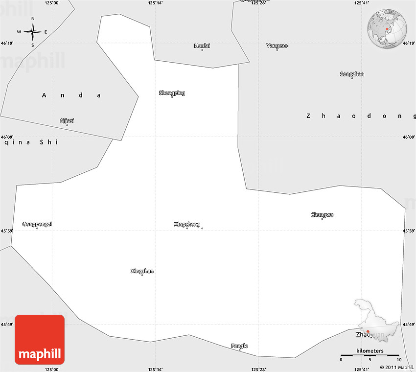 The simple silver style outline map represents one of several map types and styles available. Look at Zhaozhou, Heilongjiang, China from different perspectives.