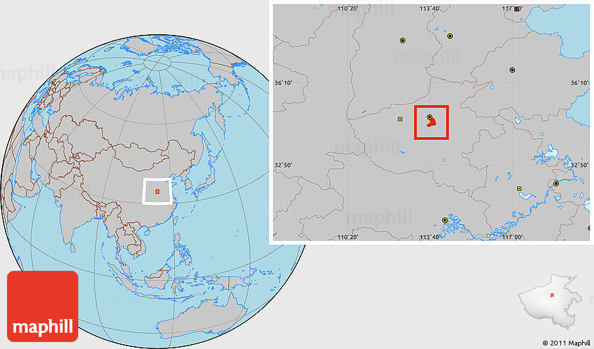 Maphill is a collection of map images. This image combines a gray map with the globe centered on Xinzheng. Use the buttons under the image to switch to different map types.