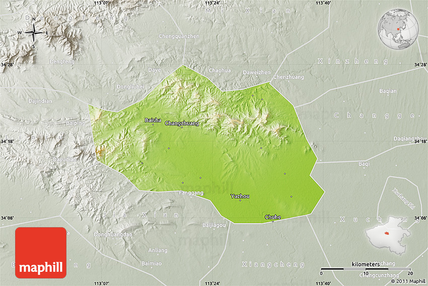 Each map type offers different information and each map style is designed for a different purpose. Read about the styles and map projection used in the above map (Physical Map of Yu Xian, lighten, semi-desaturated).