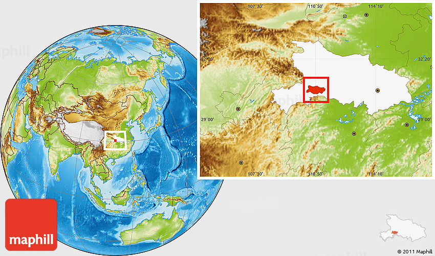 Maphill is a collection of map images. This image combines a physical map with the globe centered on Changyang. Use the buttons under the image to switch to different map types.