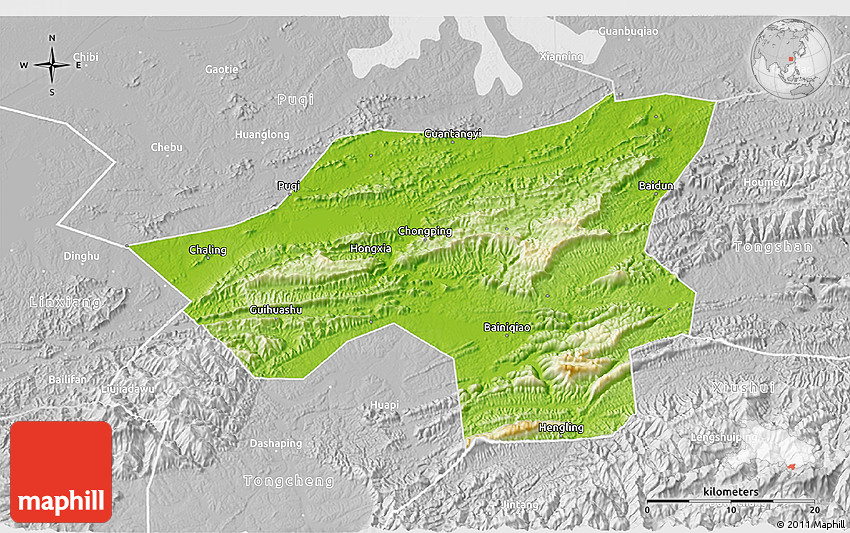 Physical map illustrates the mountains, lowlands, oceans, lakes and rivers and other physical landscape features of Chongyang. Differences in land elevations relative to the sea level are represented by color.