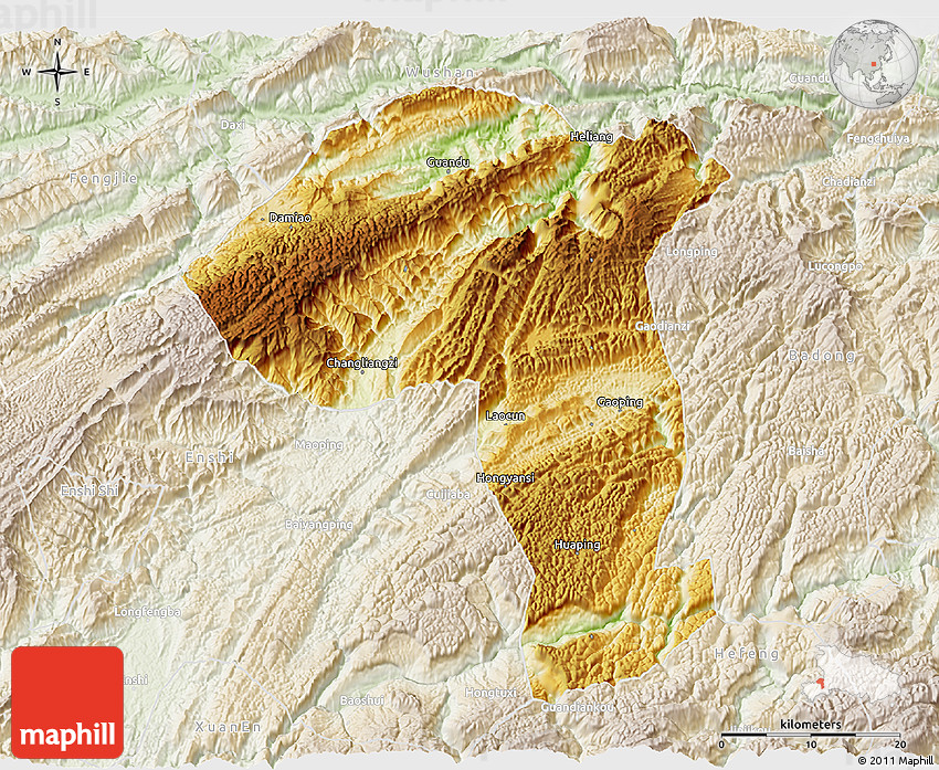 The 3D physical map represents one of several map types and styles available. Look at Jianshi, Hubei, China from different perspectives.