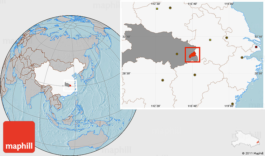 Maphill is a collection of map images. This image combines a gray map with the globe centered on Qichun. Use the buttons under the image to switch to different map types.