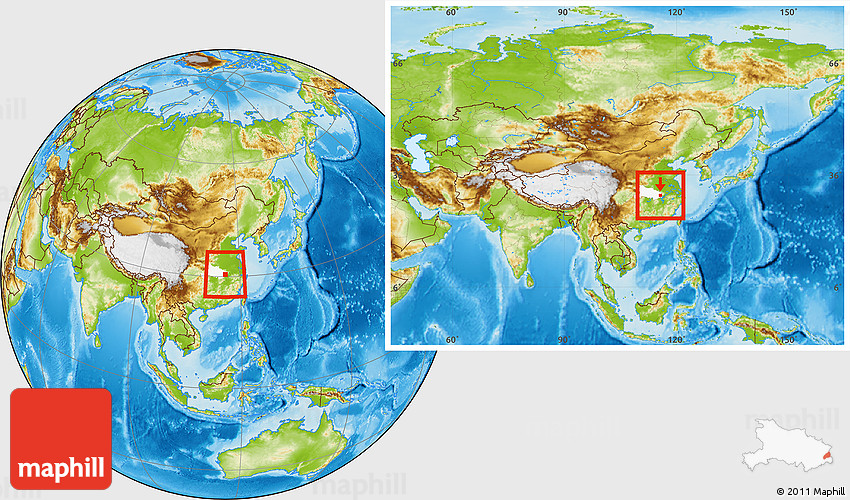 Maphill is a collection of map images. This image combines a physical map with the globe centered on Qichun. Use the buttons under the image to switch to different map types.