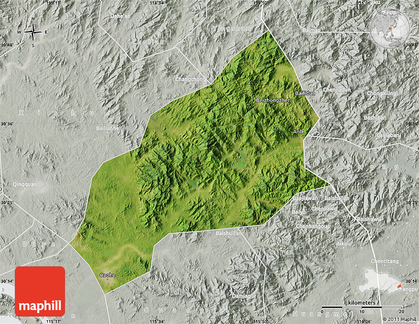 Each map type offers different information and each map style is designed for a different purpose. Read about the styles and map projection used in the above map (Satellite Map of Qichun, lighten, semi-desaturated).