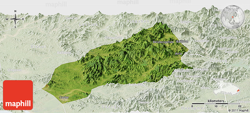 Each map type offers different information and each map style is designed for a different purpose. Read about the styles and map projection used in the above map (Satellite Panoramic Map of Qichun, lighten).
