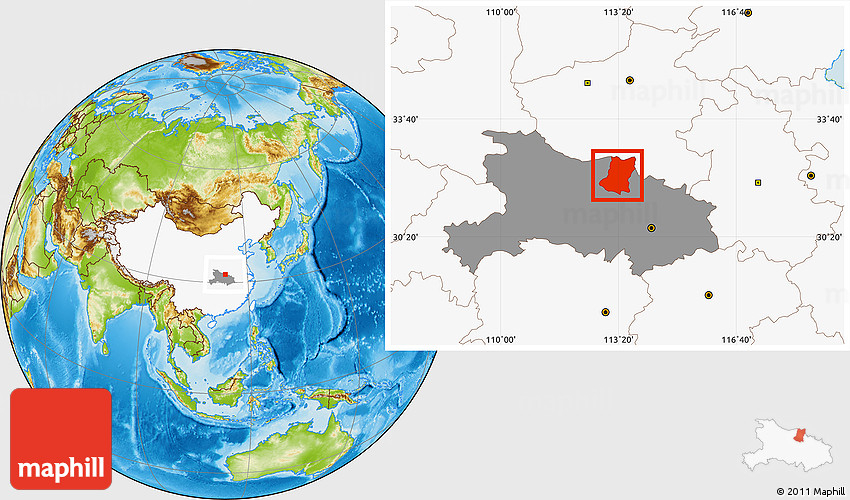 Maphill is a collection of map images. This image combines a physical map with the globe centered on Sui Xian. Use the buttons under the image to switch to different map types.