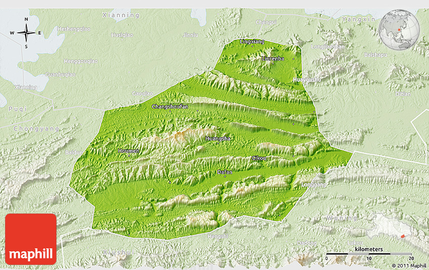 The 3D physical map represents one of several map types and styles available. Look at Tongshan, Hubei, China from different perspectives.