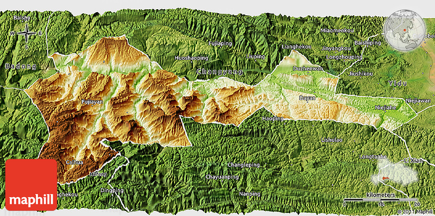 The 3D physical map represents one of several map types and styles available. Look at Wufeng, Hubei, China from different perspectives.