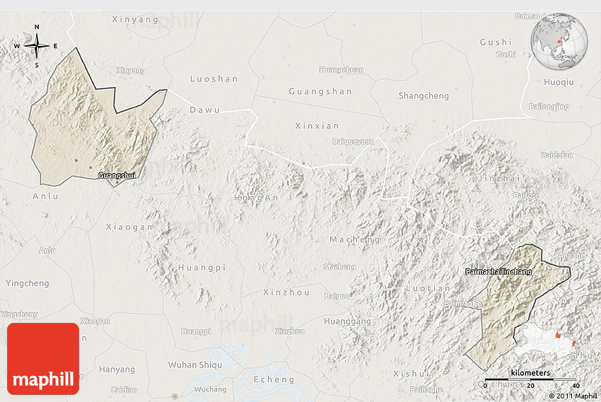 Maphill is a collection of map images. This view of Yingshan at an angle of 60° is one of these images. Click on the Detailed button under the map for a more comprehensive map.