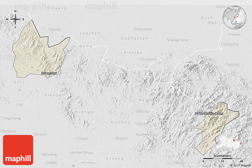 Shaded relief map shows landscape features, such as mountains, valleys and plateaus. Flat areas are smooth on the map, areas with steep slopes and mountains appear more rough. The above map of Yingshan was created using a digital elevation model.