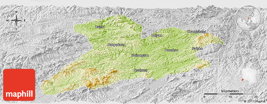 Each map type offers different information and each map style is designed for a different purpose. Read about the styles and map projection used in the above map (Physical Panoramic Map of Jing Xian, lighten, desaturated).