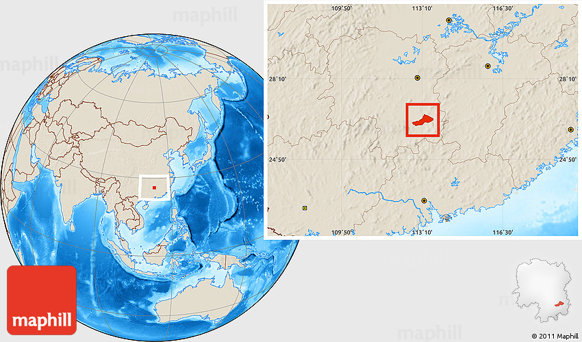 Maphill is a collection of map images. This image combines a shaded relief map with the globe centered on Yongxing. Use the buttons under the image to switch to different map types.