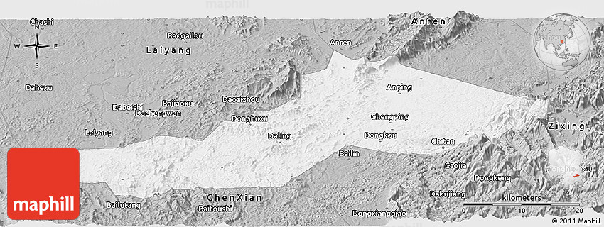 The panoramic gray map represents one of several map types and styles available. Look at Yongxing, Hunan, China from different perspectives.