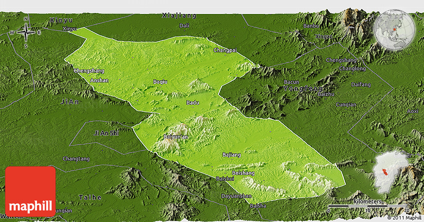 The panoramic physical map represents one of several map types and styles available. Look at Jishui, Jiangxi, China from different perspectives.
