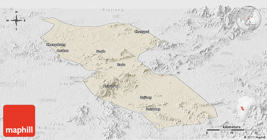 Each map type offers different information and each map style is designed for a different purpose. Read about the styles and map projection used in the above map (Shaded Relief Panoramic Map of Jishui, lighten, desaturated).