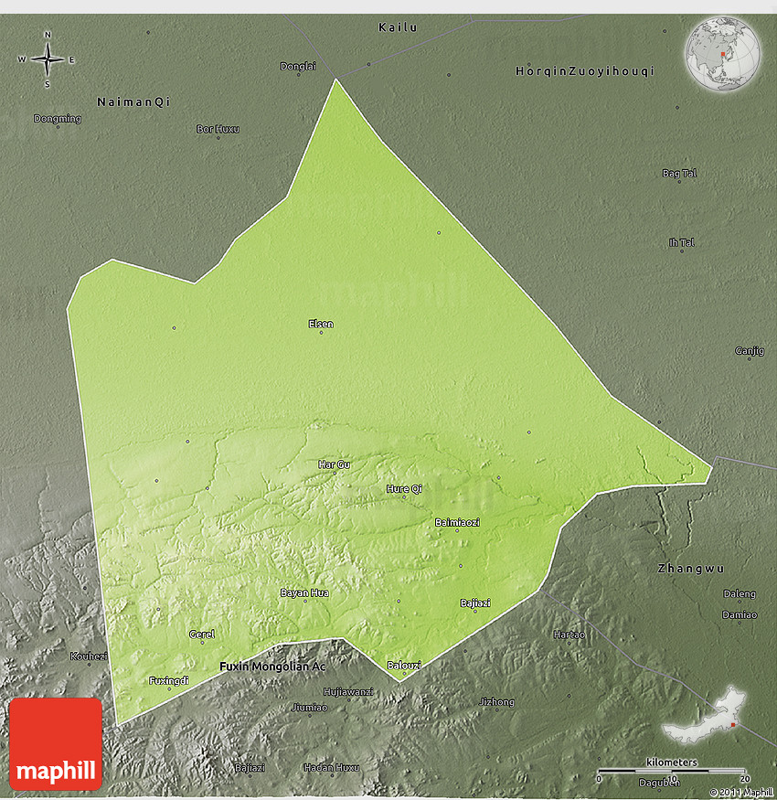 Physical map illustrates the mountains, lowlands, oceans, lakes and rivers and other physical landscape features of Hure Qi. Differences in land elevations relative to the sea level are represented by color.