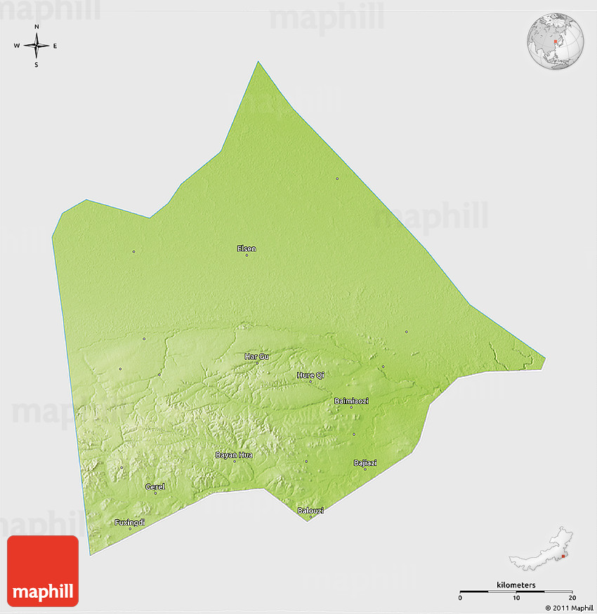 Physical map illustrates the mountains, lowlands, oceans, lakes and rivers and other physical landscape features of Hure Qi. Differences in land elevations relative to the sea level are represented by color.