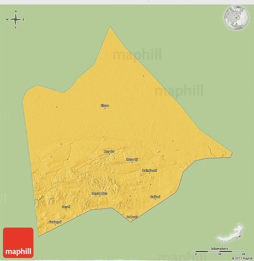 Each map type offers different information and each map style is designed for a different purpose. Read about the styles and map projection used in the above map (Savanna Style 3D Map of Hure Qi, single color outside).