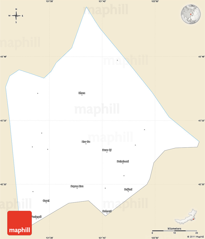 Maphill is a collection of map graphics. This simple outline map of Hure Qi is one of these images. Use the buttons under the image to switch to more comprehensive and detailed map types.