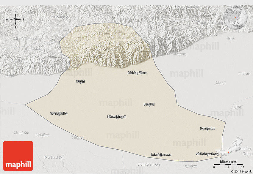 Shaded relief map shows landscape features, such as mountains, valleys and plateaus. Flat areas are smooth on the map, areas with steep slopes and mountains appear more rough. The above map of Tumd Zouqi was created using a digital elevation model.