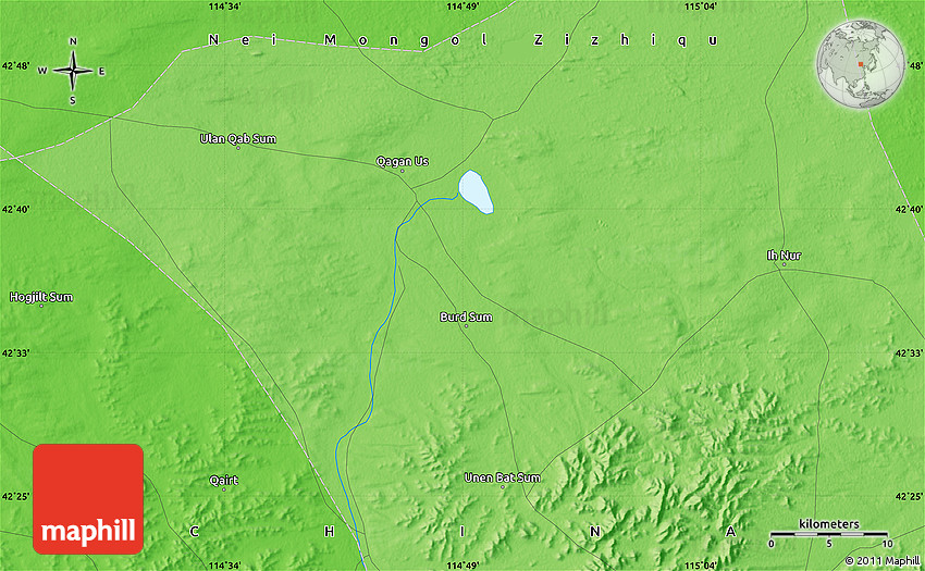 The flat political map represents one of many map types available. Look at Unen Bat Sum, Zhengxianbai Qi, Nei Mongol Zizhiqu, China from different perspectives.