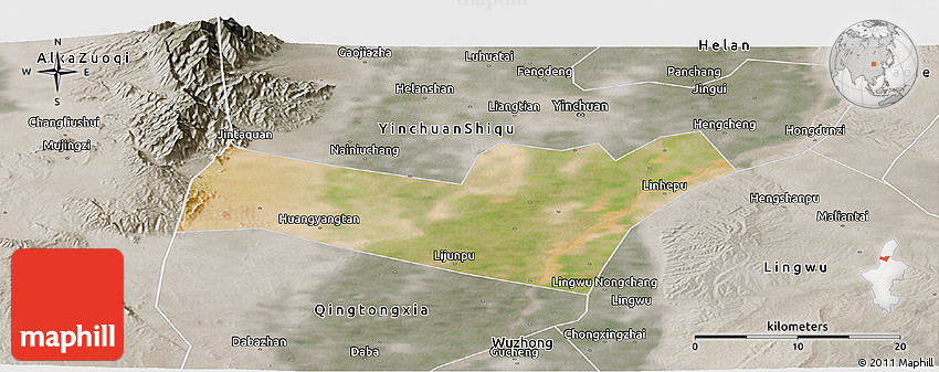 The panoramic satellite map represents one of several map types and styles available. Look at Yongning, Ningxia, China from different perspectives.