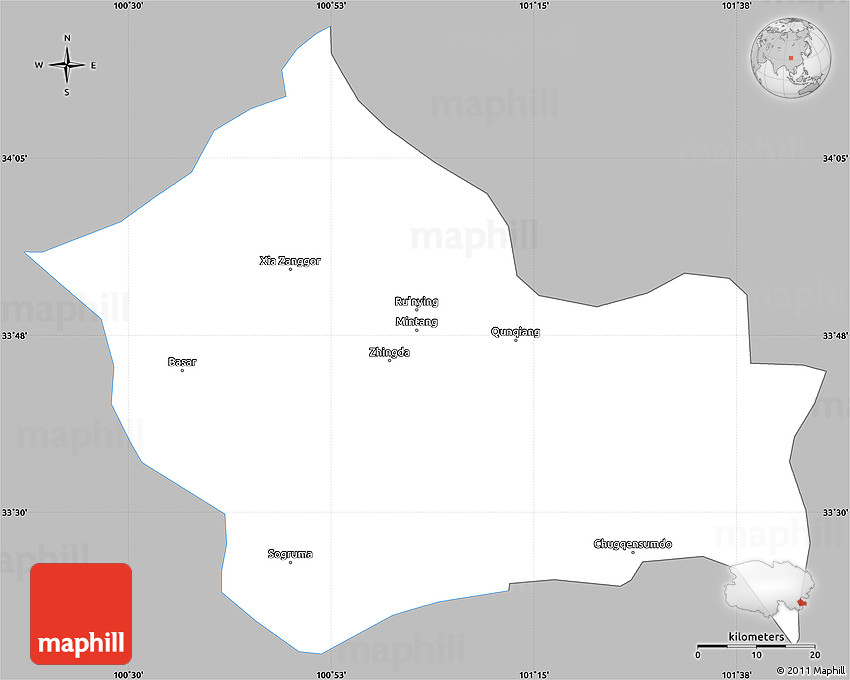 The simple gray outline map represents one of several map types and styles available. Look at Jigzhi, Qinghai, China from different perspectives.