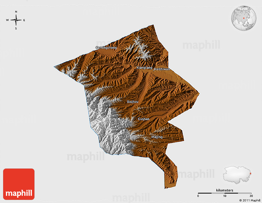 The 3D physical map represents one of several map types and styles available. Look at Minhe, Qinghai, China from different perspectives.