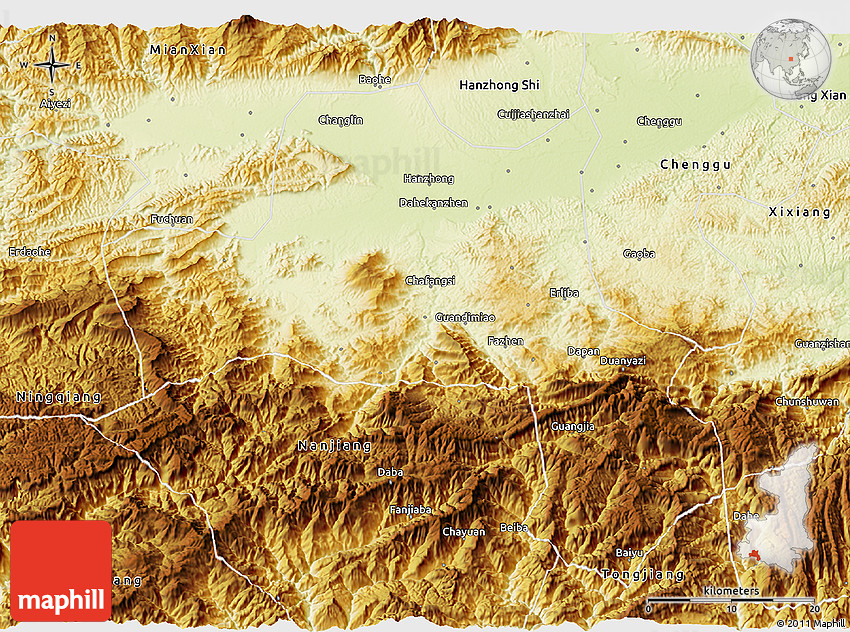 Each map type offers different information and each map style is designed for a different purpose. Read about the styles and map projection used in the above map (Physical 3D Map of Nanzheng).