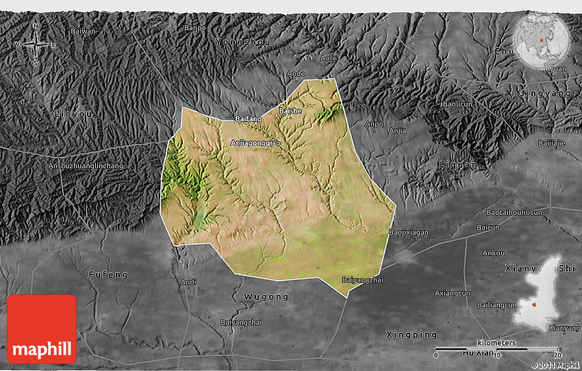 Each map type offers different information and each map style is designed for a different purpose. Read about the styles and map projection used in the above map (Satellite 3D Map of Qian Xian, darken, desaturated).